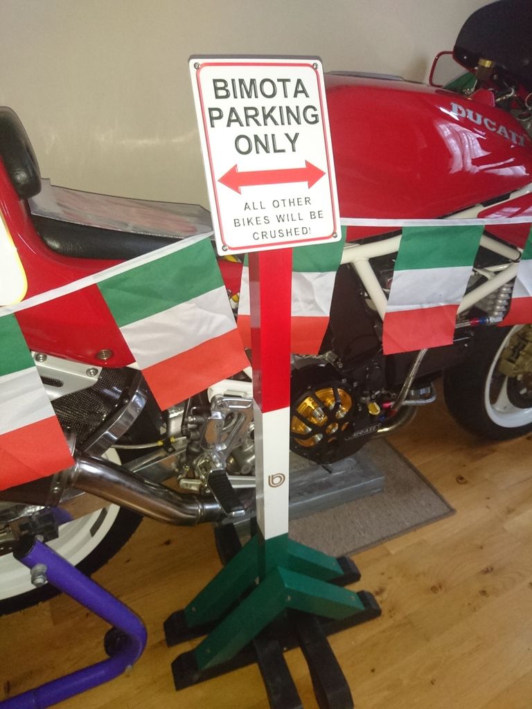 Just arrived a few days ago....we have managed to secure the "actual" reserved parking signs direct from the Bimota factory for the CEO, Segretario delle finanze (Chief Finance Officer) and Direttore vendite (Sales Director).....Which have been mounted on bases to be used to cordon off the VIP Area at the Show....Please note the teeny tiny 4mm mushroom head SS bolts to affix the signs....aka Bimota carbon mudguard and Screen fixing screws...