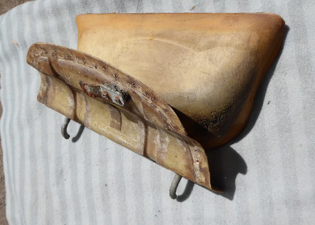 Easing the vinyl cover off the bum stop first (the staples had long since rusted and 99% of the attachment was now the glue) it was good to see that the fibre glass base was reasuringly thin (1-2mm) and light and the moulded foam good enough to reuse no problems.