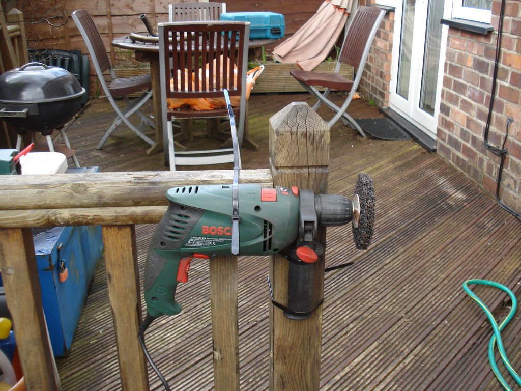 Rigged up the variable speed Bosch power drill to decking ballustrade with newly bought cable ties....."on" button can be locked for continual polishing...vari speed essential as certain mops work better at high or low speeds...as you can "burn" the wax you're applying to the surface if too high