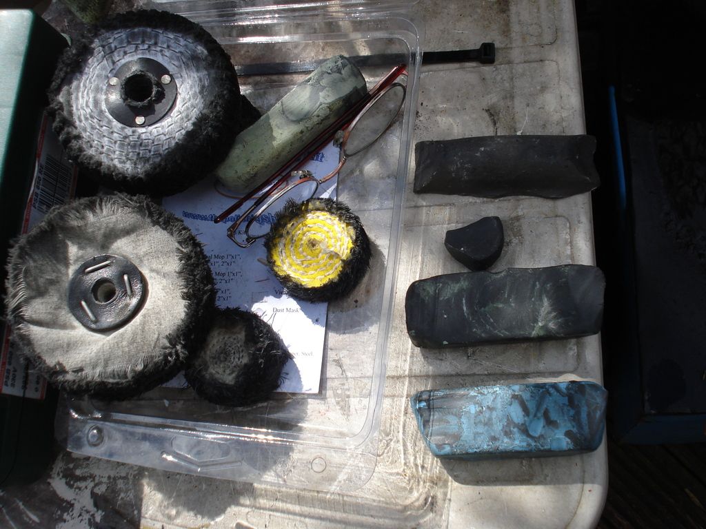 Got the old mops out and waxes///....Coarse nylon mop on power drill for deep corrosion/tarnish...then coarse sizel and grey wax...then medium sizel and green wax...finishing with fine cotton sizel and blue wax....