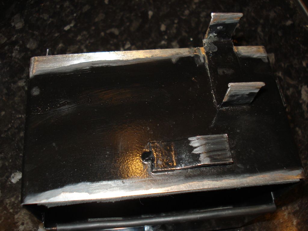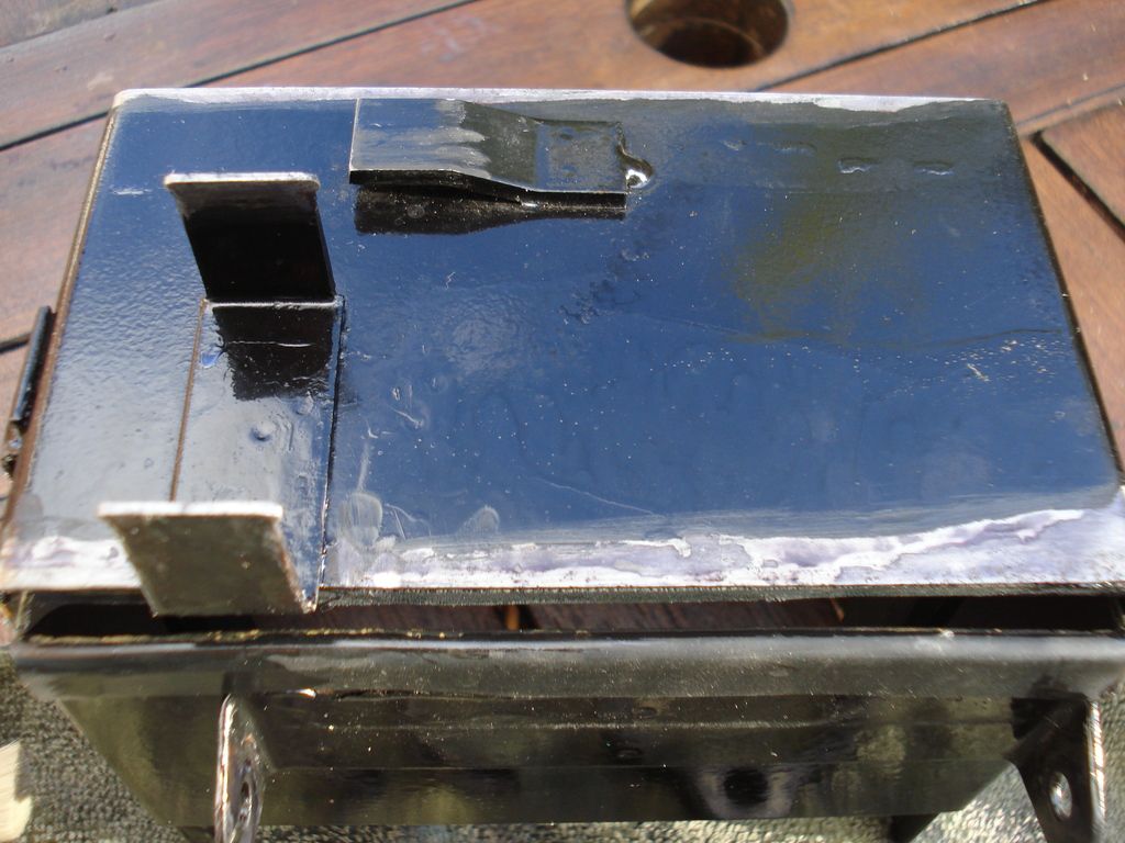 Battery box will be primed, top coated and lacquered by rattle can when the daytime temperature crawls above 10 degrees at least...I have done some before in the dining room but its amazing how much airbourne powder comes out...takes forever to clean...so I use a sheltered draft free space outside for painting with rattle can...