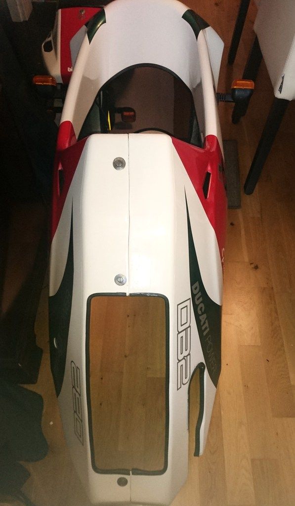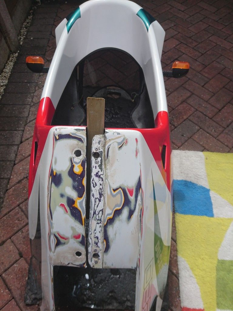 I've been busy tarting up the underside of the bellypan....after its many years of getting stone chips thrown from the front wheel...and being dragged over the ground come removal of the full one piece fairing....so have been sanding back the years of the paint on the underside......white first...then primer...then purple...then yellow...then red from the original red white scheme...then white...then primer...then fibreglass...will post up the dayglo colouring soon as I've just about finished the underside......