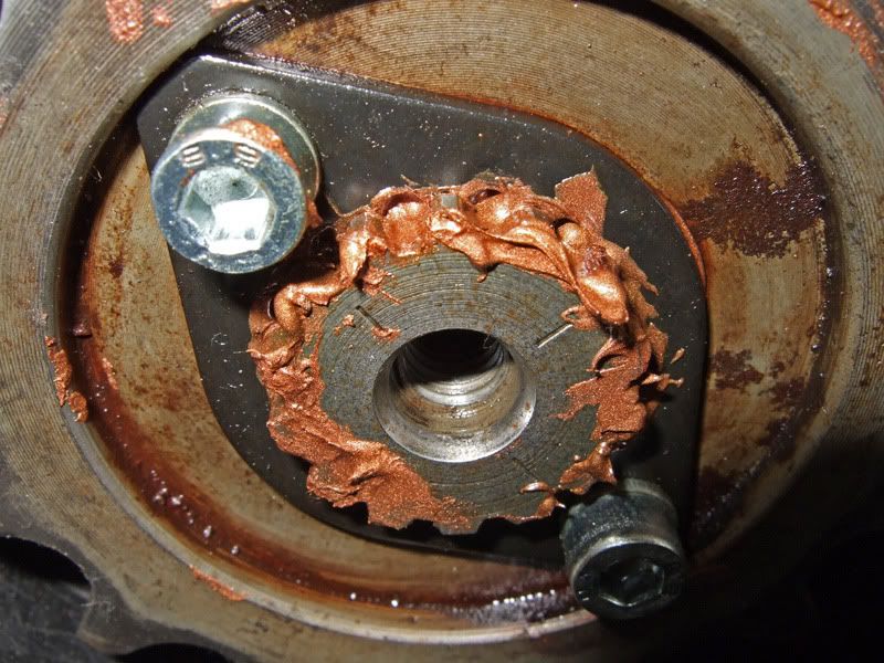 This is the only picture I have of the one that was on my Paso 750, but I think you can see how it is recessed on the one side. This sprocket allows the use of a regular Ducati retainer. I'm thinking this is the route I may wind up going, some day, if I cannot find another OEM Bimota retainer.